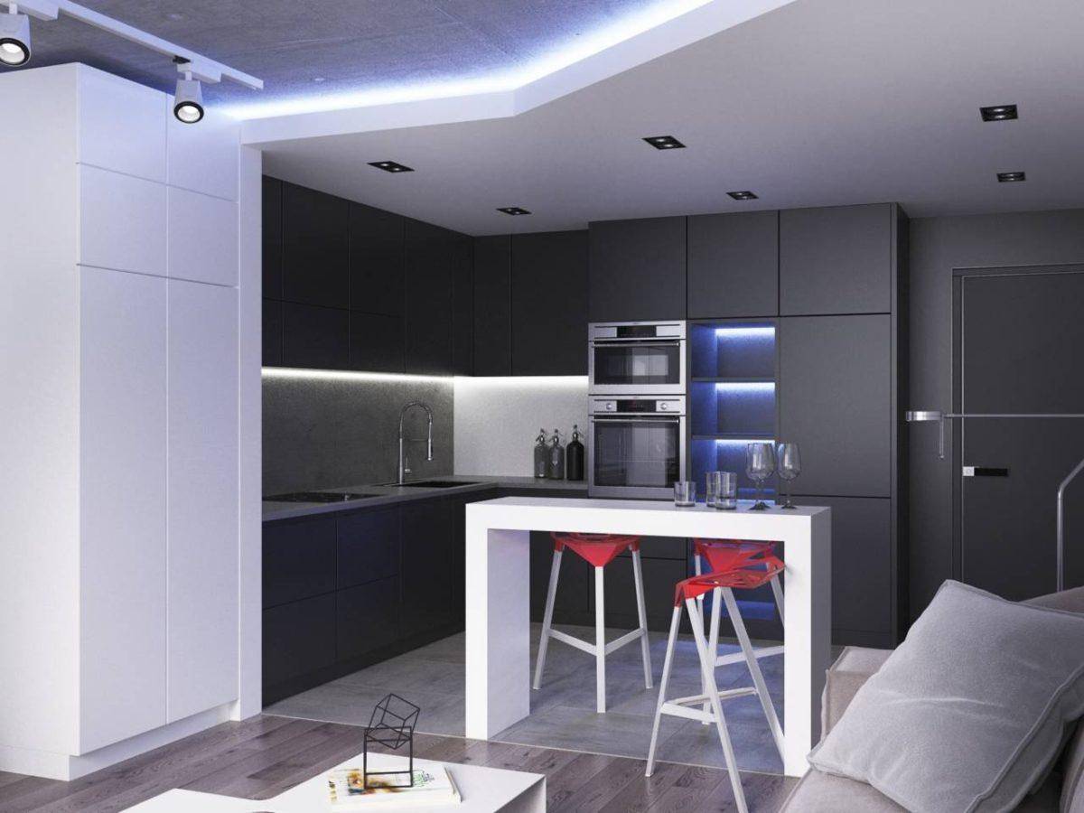 При освещении пространства лучше всего применять точечное, так как использование люстр в центре будет уменьшать помещение, и отбирать свободную площадь. Напольные светильники использовать не рекомендуется.