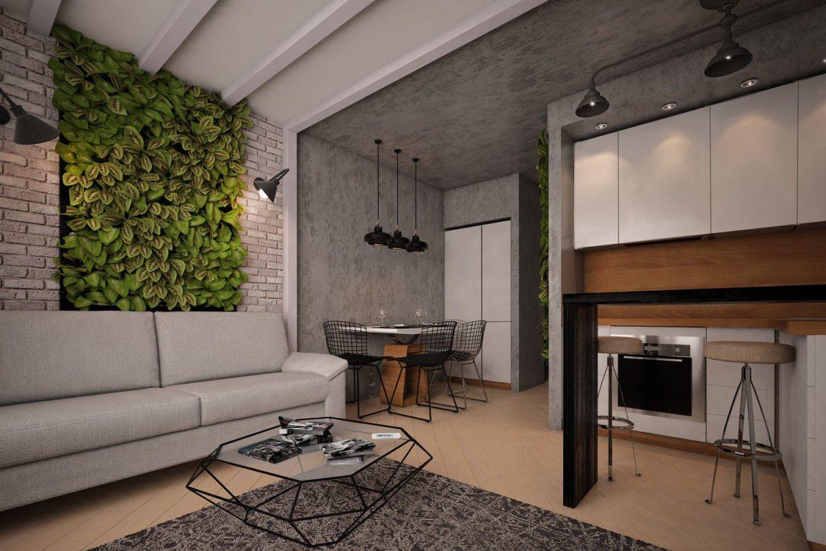 Подойдёт и белый гарнитур с гладкими фасадами и столешницей из дерева. Мягкая мебель может быть приглушённых темноватых оттенков – серого, серо-синего, хвойного. Интерьер оживят горшки с живыми растениями.