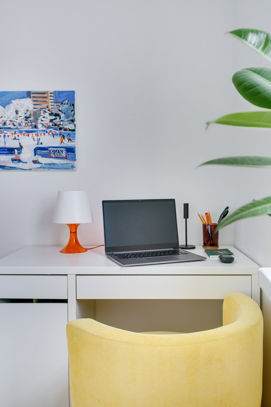 За счет достаточного количества окон удалось изолировать спальню, разместить в ней рабочее место и систему хранения. В кухне-гостиной встали кухня со всей необходимой техникой, обеденный стол с удобными стульями и большой диван — он еще и раскладывается.