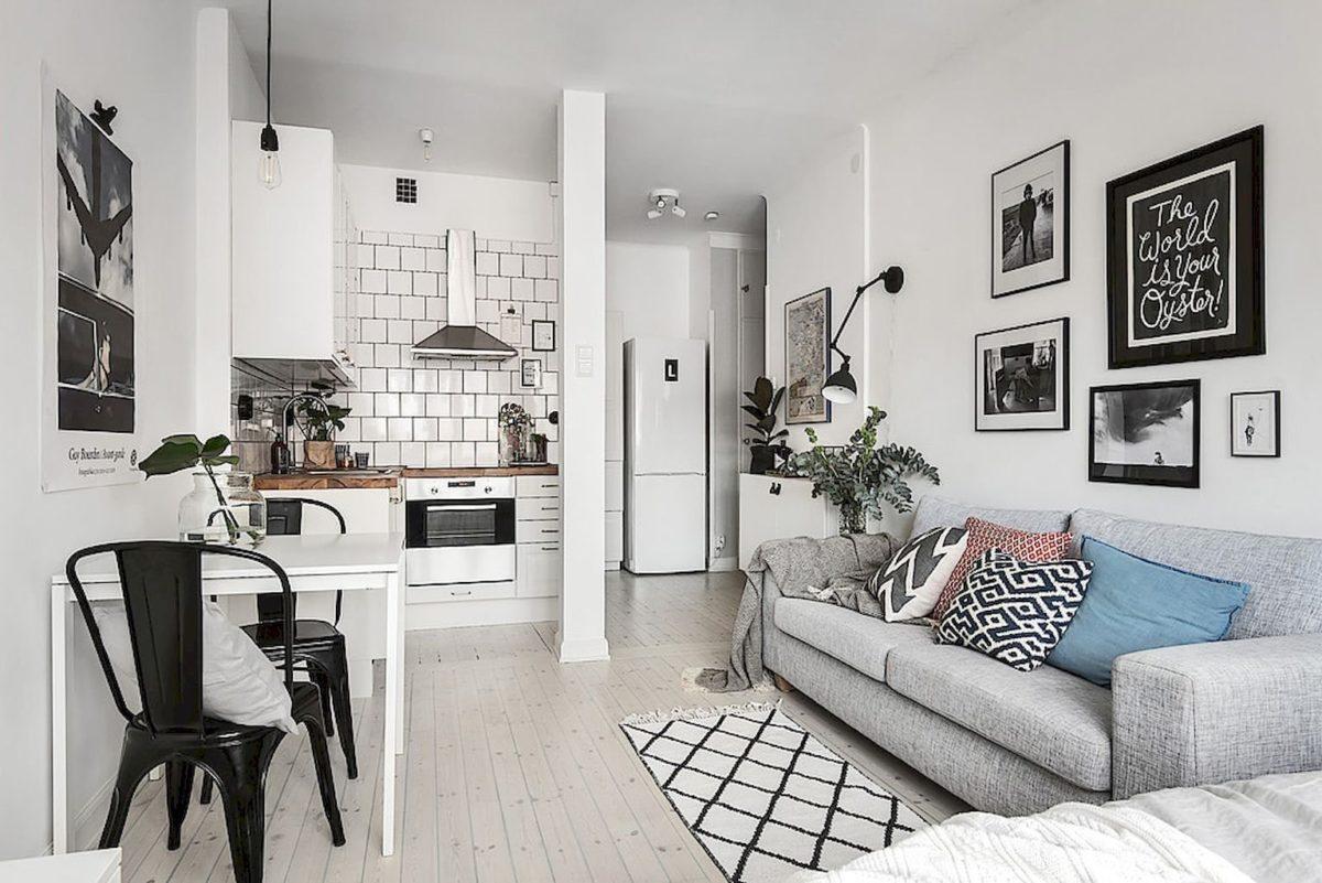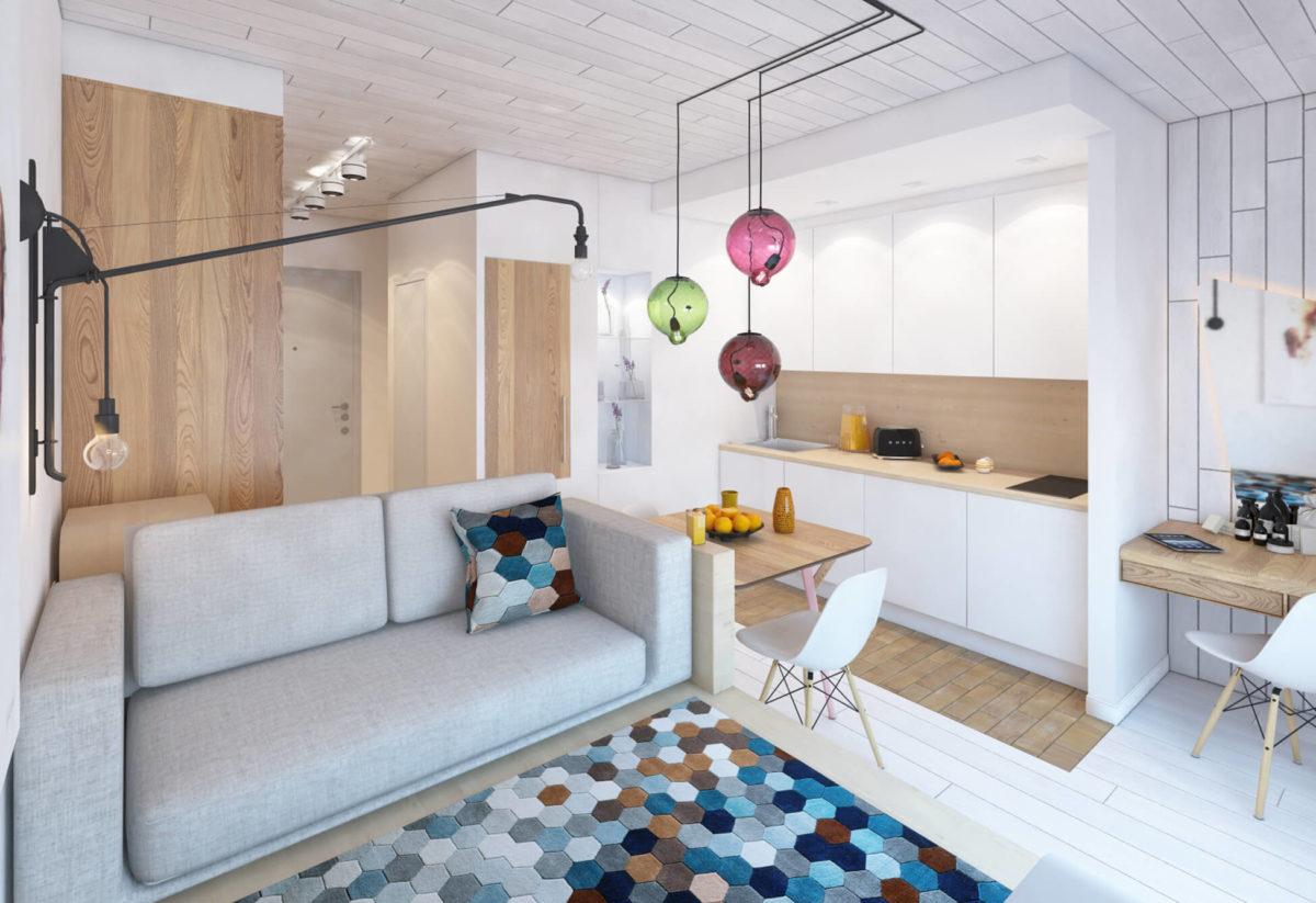 Основные принципы скандинавского дизайна – светлые тона, небольшое количество тёмных или ярких акцентов, минимализм и практичность – отлично подходят для квартиры-студии. Стиль приветствует натуральные материалы: для пола подойдёт паркетная доска или керамогранит, гарнитур выбирают из натурального массива или его качественной имитации.
