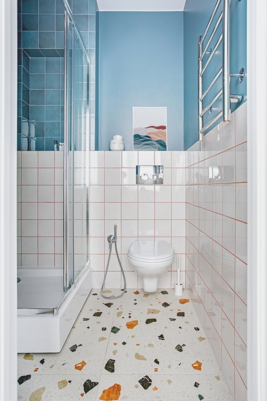 «Чтобы интерьер не казался безликим и скучным, мы похулиганили в санузле: скомбинировали напольный керамогранит с текстурой терраццо с двумя видами плитки: белой и серо-голубой. Затирки выбрали цветные: для белой плитки — рыжую (в цвет напольных камушков), а для серо-голубой подобрали схожий оттенок. Плитку скомбинировали с покраской. Часть стен покрашена в тон серо-голубой плитке, чтобы верх смотрелся единым объемом», — рассказывает Анна Суворова.