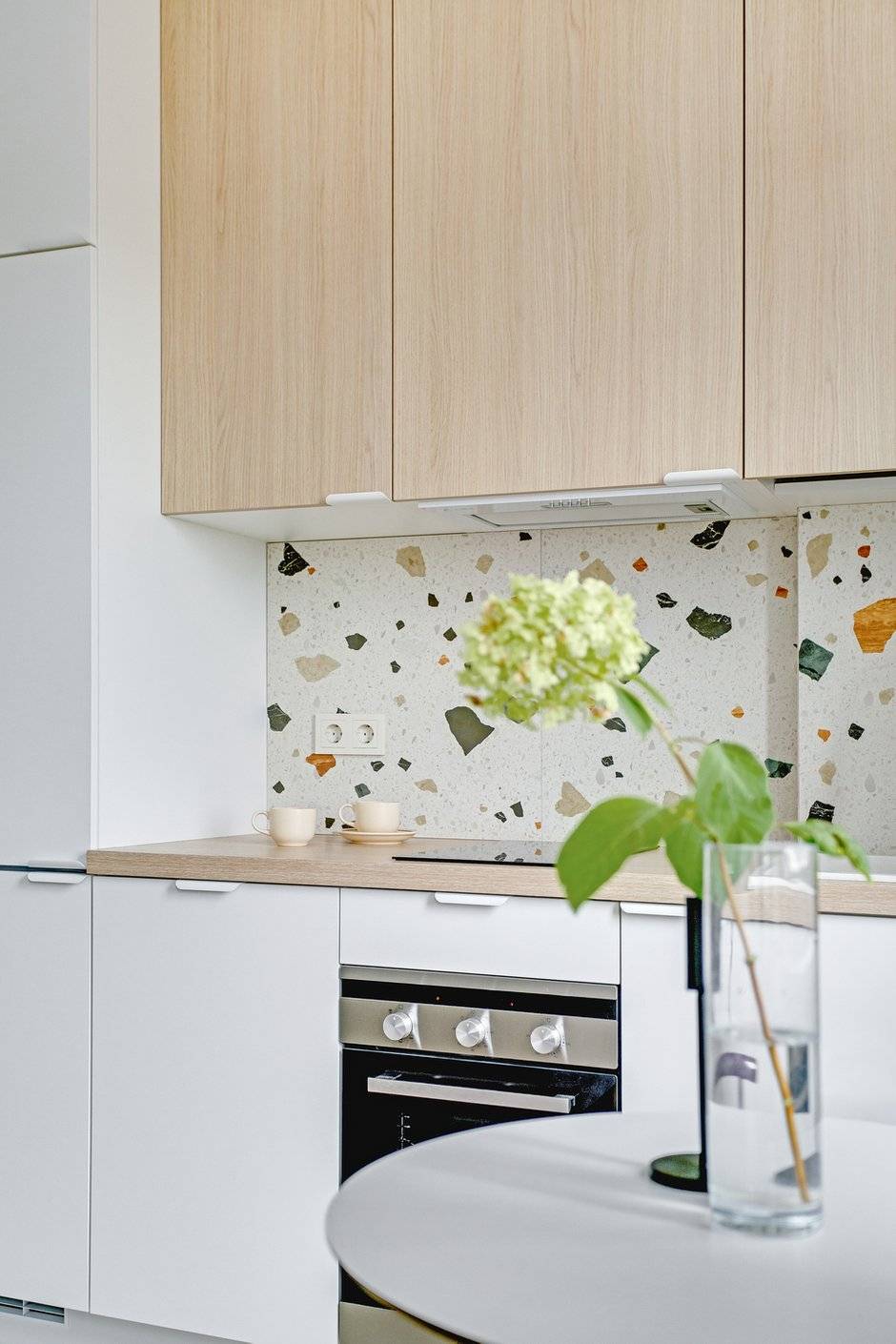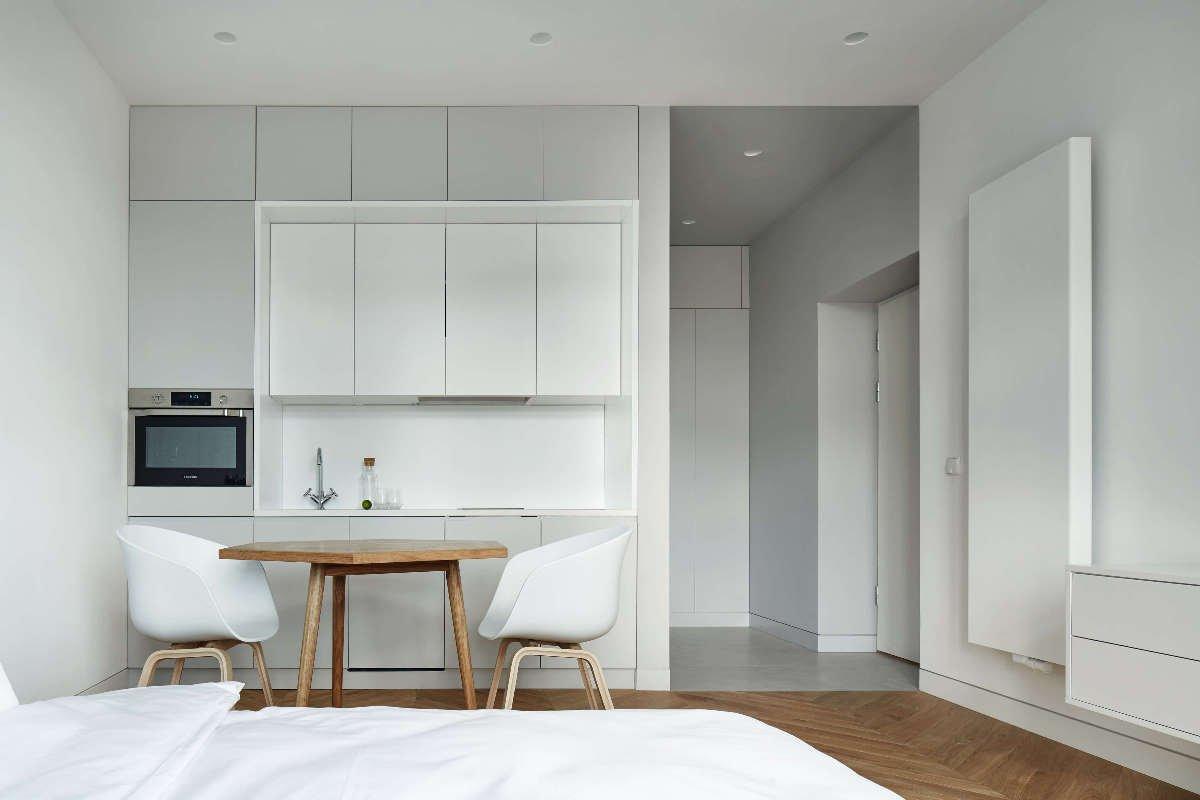 Сэкономить место на столешнице помогла двухконфорочная варочная панель. От вытяжки и духовки отказались, так как дизайнер не видит в них необходимости в апартаментах для посуточной аренды. В нижних ящиках оставили место для компактной посудомоечной машины, предусмотрели установку для микроволновой печи.