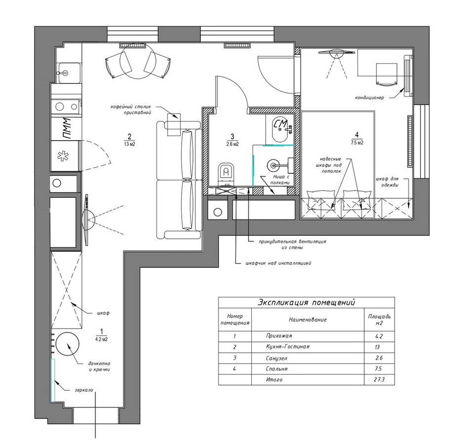 В неординарных случаях, рекомендуется прибегать к услугам профессиональных дизайнеров. Если же квартира небольшая 26 кв.м. на фото, традиционной формы, обустроить помещение, можно своими руками.
