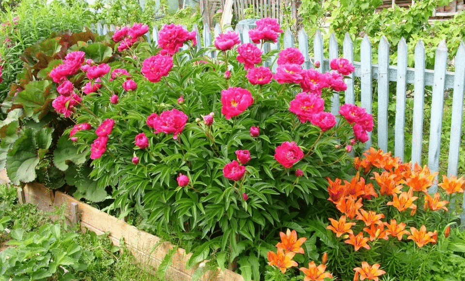 Центральное место в летнем саду занимает многолетний пион. Кустарник предпочитает яркое освещение в течение всего дня и совершенно не переносит затенения.