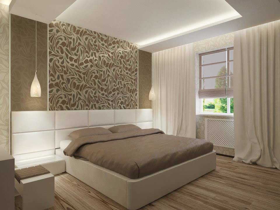 Хороший способ оригинально зонировать комнату. Он может объединить две разные фактуры обоев. В спальне отдается предпочтение более спокойным и нейтральным цветам. Горизонтально расположенный молдинг зрительно расширяет небольшое пространство спальни.