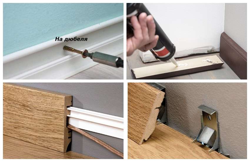 В современных моделях плинтусов предусмотрены выемки для клипс (обычно это профили из дерева и МДФ), в пластиковом и металлическом профиле есть специальный несущий элемент, который закрепляется к основе, после чего на него фиксируется верхняя декоративная планка.