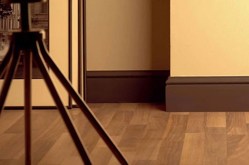 - Для полов из массива дерева и ламината прекрасно подходят деревянные плинтусы. Линолеум, ковролин сочетаются с планками из ПВХ. Керамические изделия дополняют плиточные полы. Шпонированные и МДФ-плинтусы универсальны, применяются с различными видами напольных покрытий.