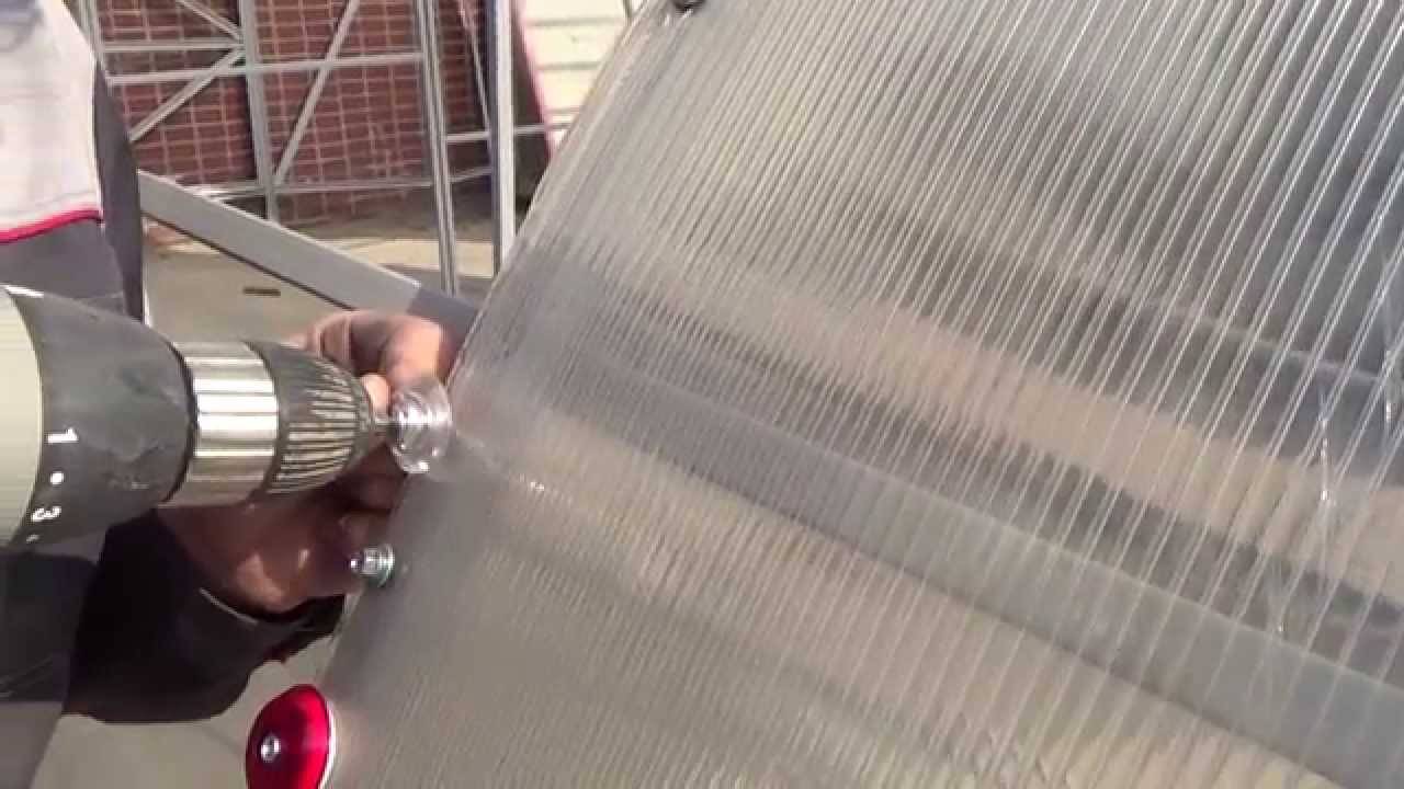 Теперь ознакомимся с тем, как происходит монтаж поликарбоната на металлический каркас с помощью термошайб с фиксирующей ножкой.