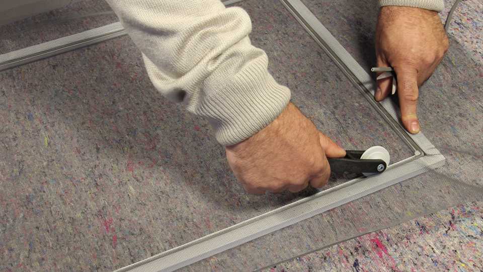 Установка сеточного полотна в рамочный профиль москитной сетки.