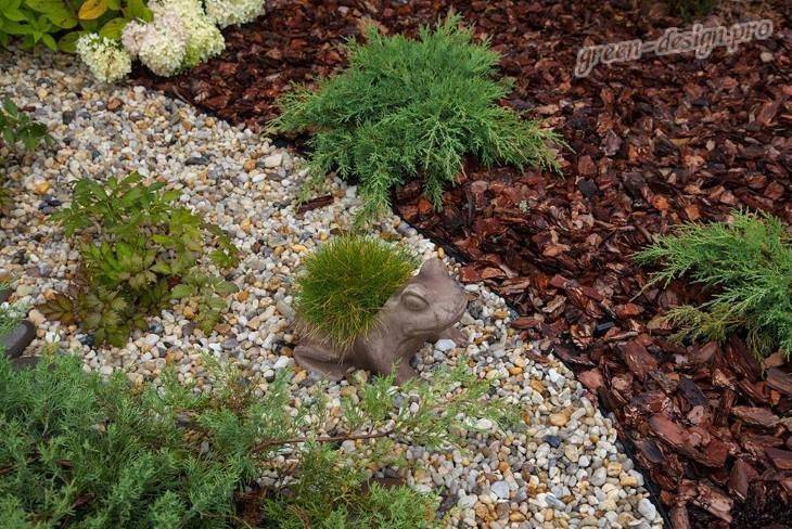 Там, где мульча помимо всего прочего служит элементом ландшафта, используют гальку, щебень, гравий, мраморную или цветную каменную крошку. Такая мульча долговечна и устойчива к неблагоприятным воздействиям погоды (жаре, ветру, ливням). И почва под ней не теряет своей естественной структуры и живет «полной жизнью».