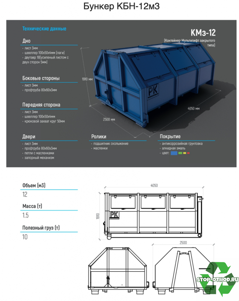 - 10 м3 ― бункер для отходов открытого типа. Предназначен для хранения мусора коммунально-бытового хозяйства, строительных работ. Удобен как для одноразовой транспортировки, так и для систематического вывоза мусора.