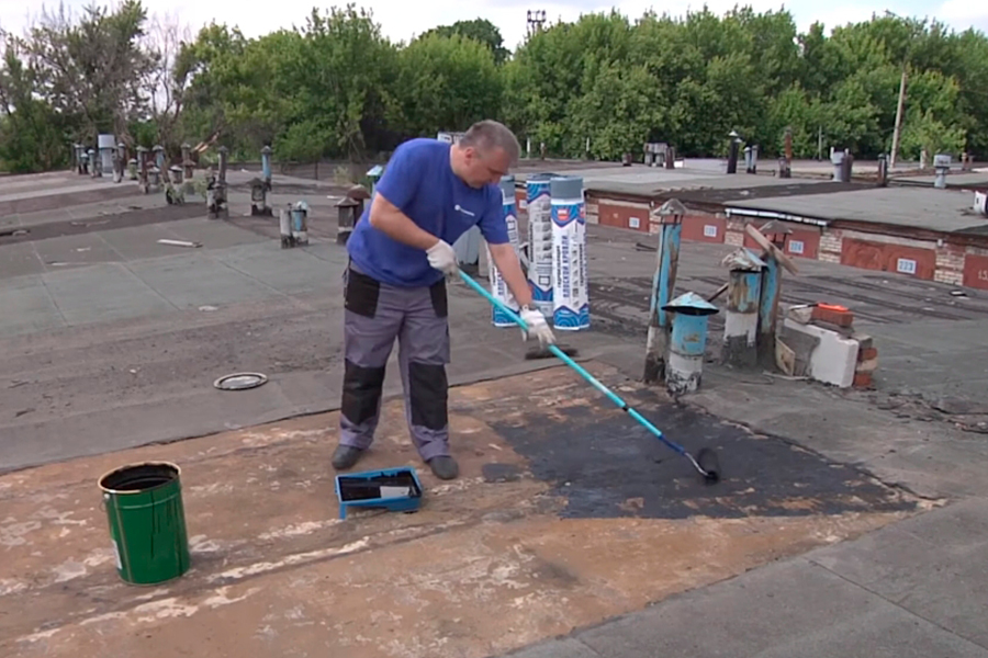 - Поверхность основания грунтуют битумной мастикой с помощью валика для образования липкой пленки, улучшающей адгезию между наплавляемой кровлей и прикрытием.