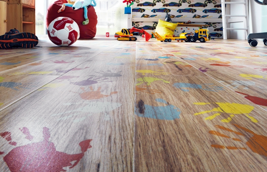 Ламинат обладает устойчивостью к механическим воздействиям. Он выдержит шумные детские игры, не пострадает от игрушек, отмоется от краски и других веществ. При этом ламинат сохранит свой внешний вид надолго.