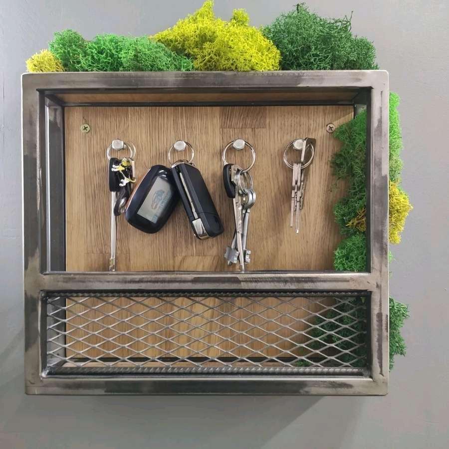 Оригинальное решение ключницы в стиле лофт – наполовину открытый короб, решетка из металла и простые гвоздики в качестве крючков.