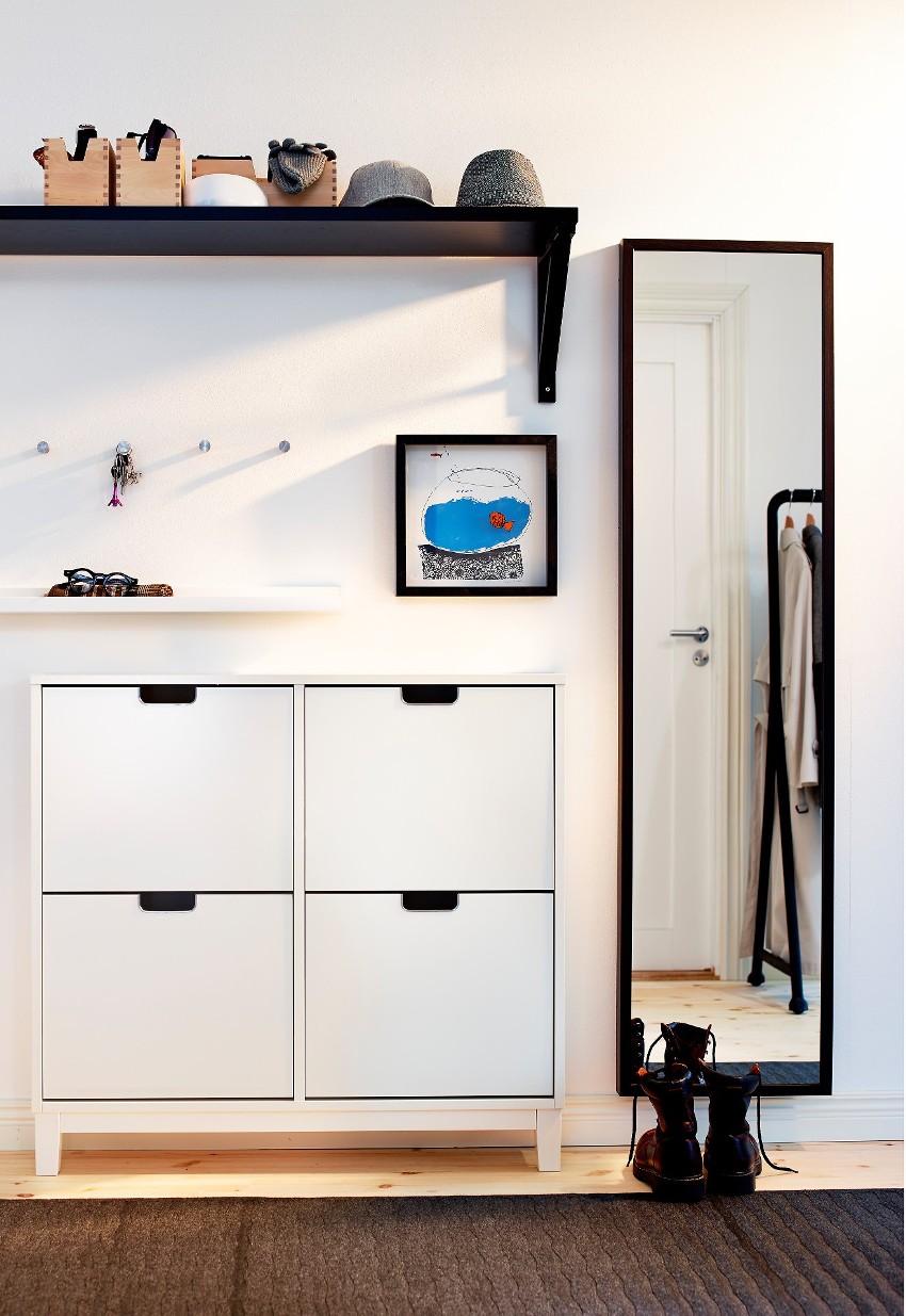Белый цвет контрастно выделяется на стене, окрашенной в один из оттенков серого. Внизу располагается удобная тумба с ящиком, на которую можно присесть во время обувания