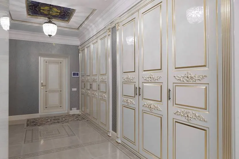 Идеально в белой классической прихожей смотрятся позолоченные светильники, мебельная фурнитура и аксессуарыИсточник design-homes.ru