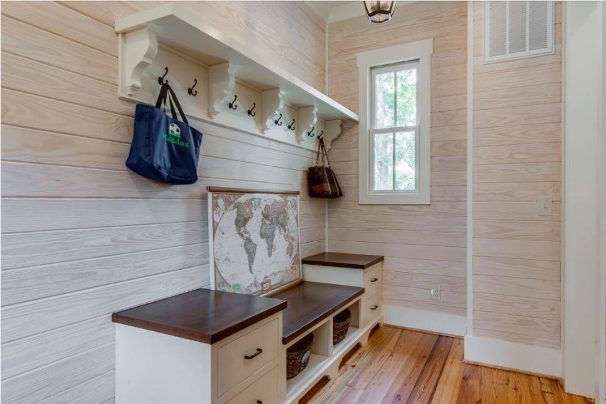 Горизонтальные вешалки, представляющие собой лишь перекладину с крючками в один или несколько рядов, очень компактны и могут крепиться на высоте доступной, даже для самого маленького члена семьи. Это самая простая конструкция для хранения повседневной верхней одежды в прихожей.