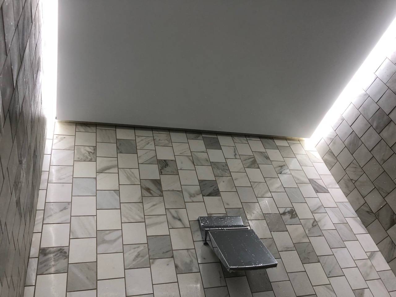 Более того натяжной потолок останавливает жидкость при затоплении сверху. Перед тем как лопнуть, один квадратный метр пленки выдерживает до 100 л воды. При помощи прокола жидкость аккуратно сливается в канализацию, что предотвращает затопление собственной ванны и соседей снизу