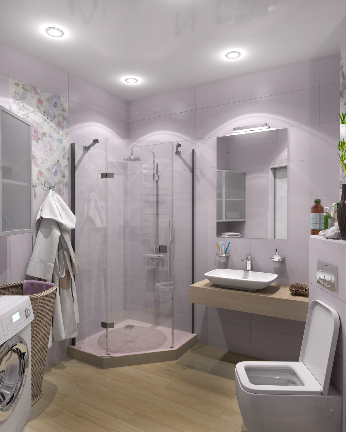 - Освещение в ванной может быть общим или многоступенчатым. С помощью точечных светильников разной мощности, встроенных в натяжной потолок, можно усилить освещение отдельных зон: умывальника, зеркала, туалетного столика.