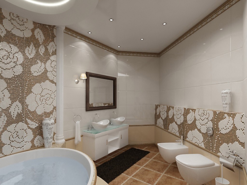 Использование цветочных принтов в тон плитке на потолке смотрится оригинально и свежо, но использовать их лучше в достаточно просторном помещении.
