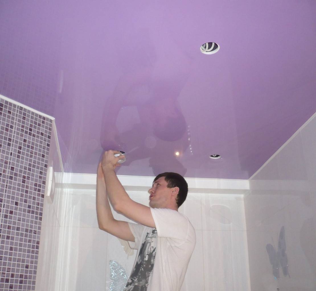 Особенно часто такие ситуации возникают, когда ремонт еще не завершен, а потолок уже натянут. При установке душевых кабинок, полочек и прочего не сложно повредить глянцевый потолок в ванне инструментом или элементами конструкции этих изделий. Таким образом лучше монтировать потолок в самую последнею очередь.
