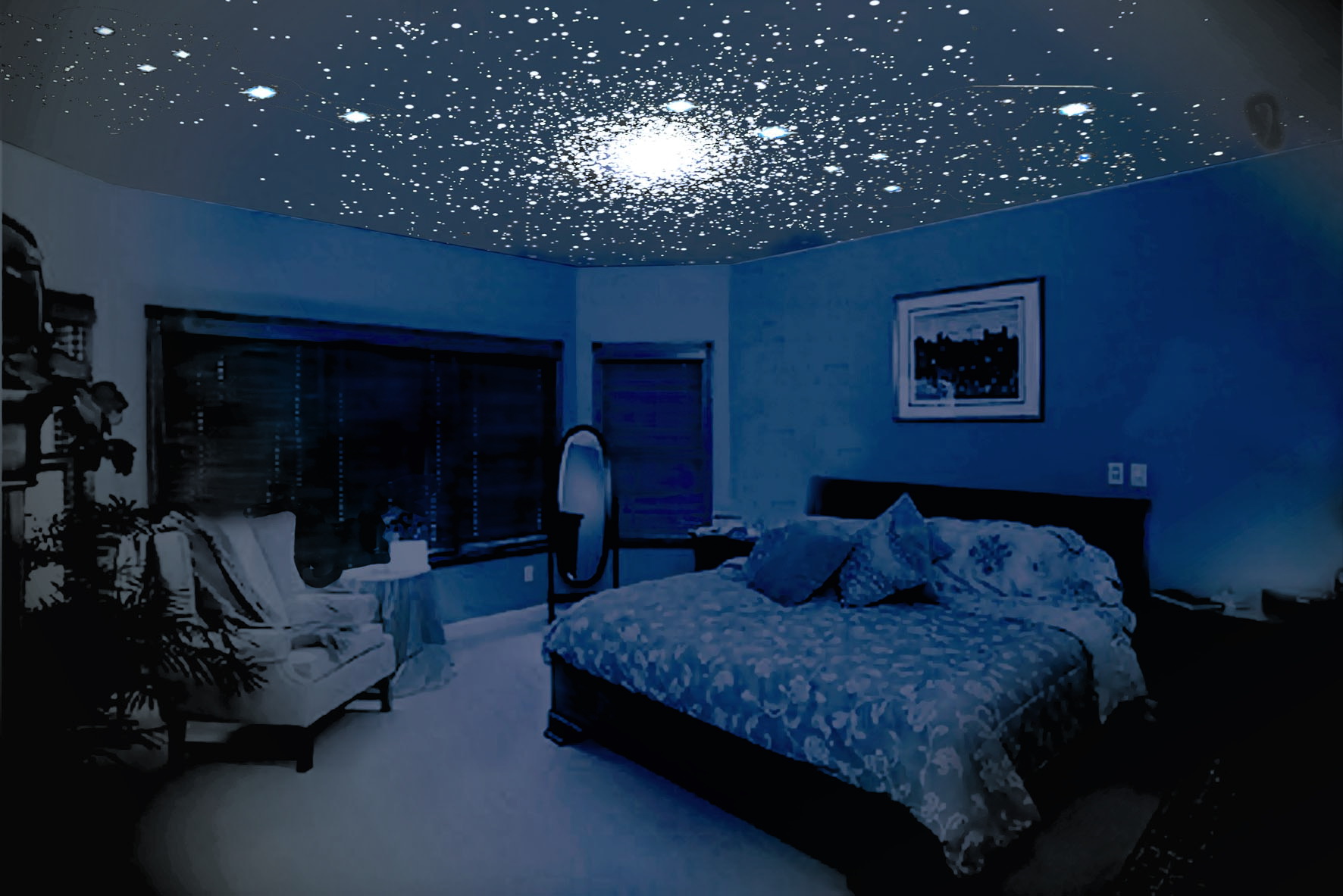 3. Звездное небо – конструкция создает точное отображение звездного неба. Имеется несколько способов монтажа подобного дизайна – своими руками можно сделать небо над головой с использованием специальной краски с добавлением люминесцентного состава.