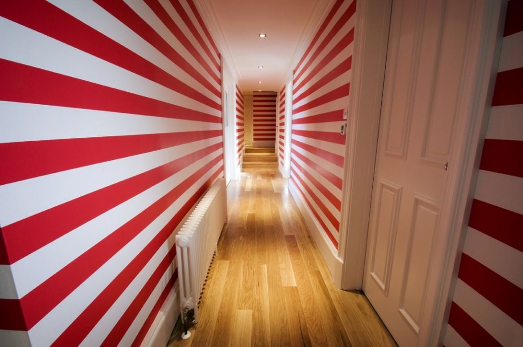 Широкие контрастные полосы скрадывают больше пространства, чем узкие. Последние могут частично спрятать дефекты и неровности стен. Поэтому их часто используют для маскировки ниш или скрытых дверных проемов.