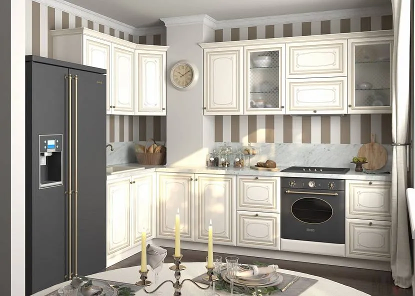 Строгие полосы пастельных оттенков на кухнеИсточник mrdoors.ru