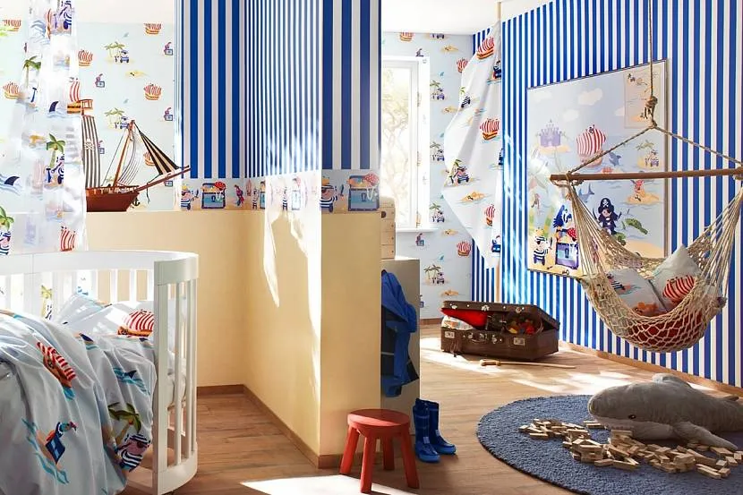 Комнату для малышей можно оформлять в ярких, но не кричащих цветах, таких как желтый, розовый, голубой, оранжевый. Полосы на стенах позволяют произвести грамотное зонирование пространства.