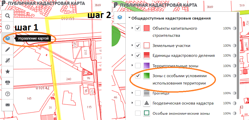 Для того чтобы открыть графику особых зон, необходимо нажать на поиск (значок лупы), выбрать управление картой и галочкой отметить ЗОУИТ (см. рис.).