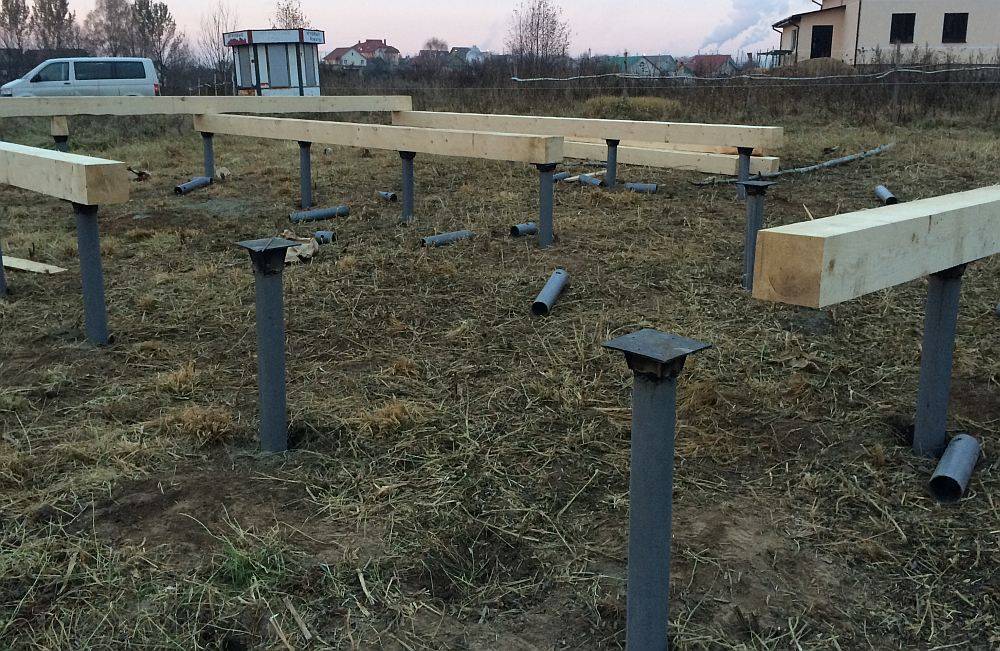 - Высота свайных столбов выравнивается по одному уровню;