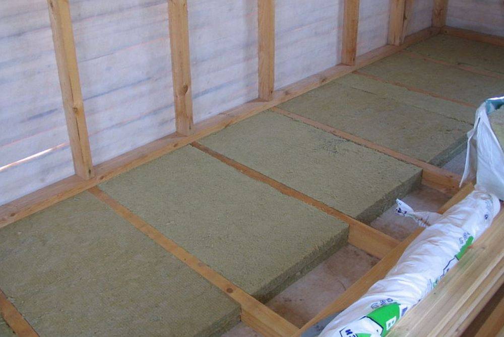 Утепление пола в каркасной пристройке делают аналогичным образом. В щели между лагами чернового пола укладывают минеральную вату, а доски покрывают слоем гидроизоляционной пленки. Когда утеплитель установлен, поверх него снова помещают гидроизоляцию, а затем обшивают пол фанерой и устанавливают окончательное покрытие.