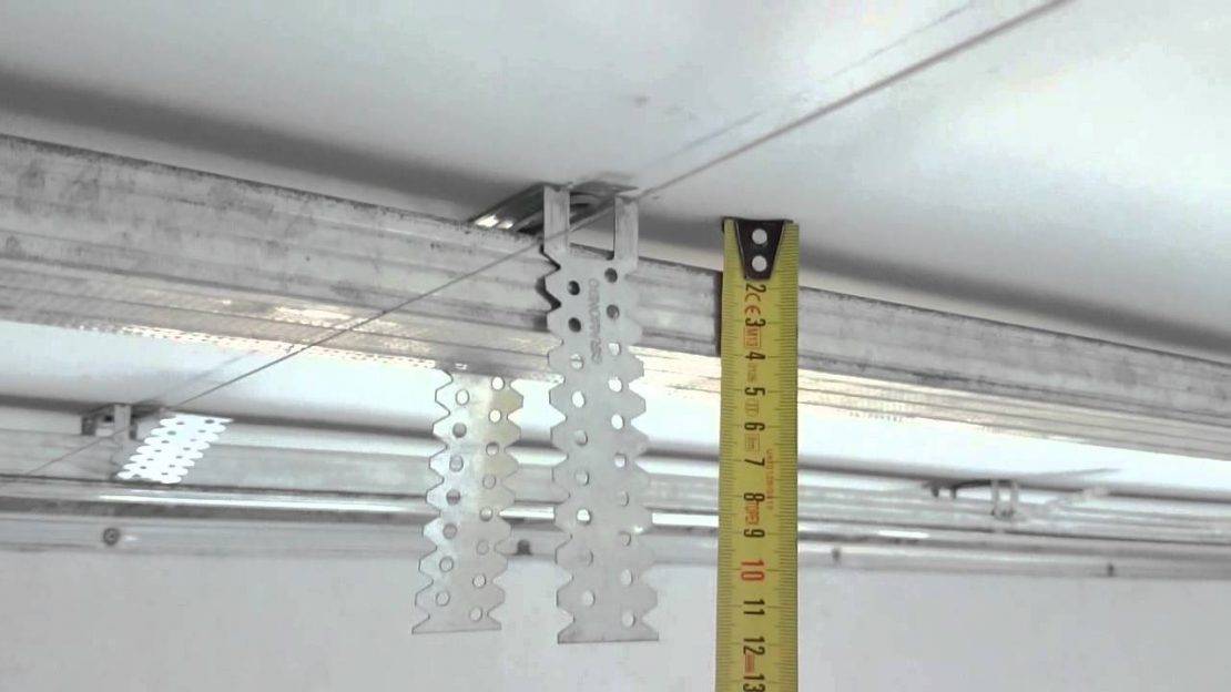 Чтобы проверить ровность каркаса, внизу натягивают капроновую нить. Расстояние между потолком и нижним краем профиля регулируют подвесами. Потолочный и направляющие профили соединяют саморезами.