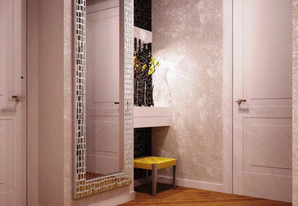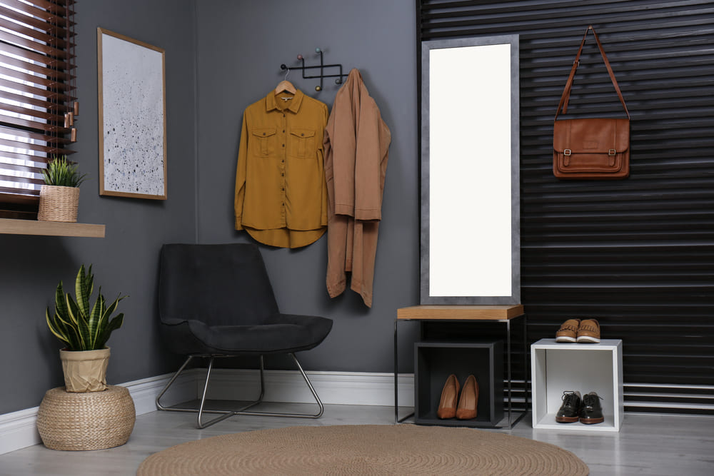 Прекрасно, если места достаточно для размещения шкафа-купе с зеркальными панелями. Это решение зрительно увеличит пространство. В небольших прихожих выигрышнее смотрятся простые зеркала — без тонировки и узоров.
