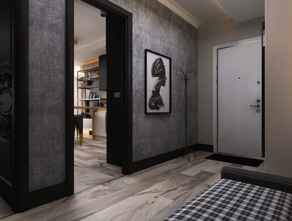 Интерьер прихожей в квартире-студии не терпит экономии на материалах, поскольку необходима детальная проработка сразу всех составляющих – напольного покрытия, стен, потолка, освещения и мебели.