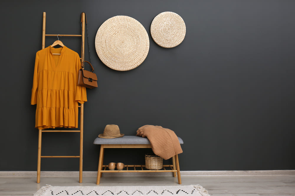 - Шкаф для верхней одежды можно заменить вешалкой – верхняя полка используется для головных уборов, настенная часть посередине – для пальто и плащей, а внизу размещается ящик-пуф для обуви. Отлично экономят место и напольные вешалки – сюда можно поместить как верхнюю одежду, так и зонты, освободившись от специальной подставки.