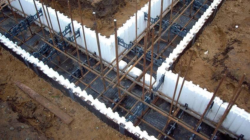 Основным преимуществом комбинированной конструкции можно назвать то, что она выполняет и вспомогательную, и теплоизоляционную функцию. Фундамент защищается с боков и со стороны подошвы.