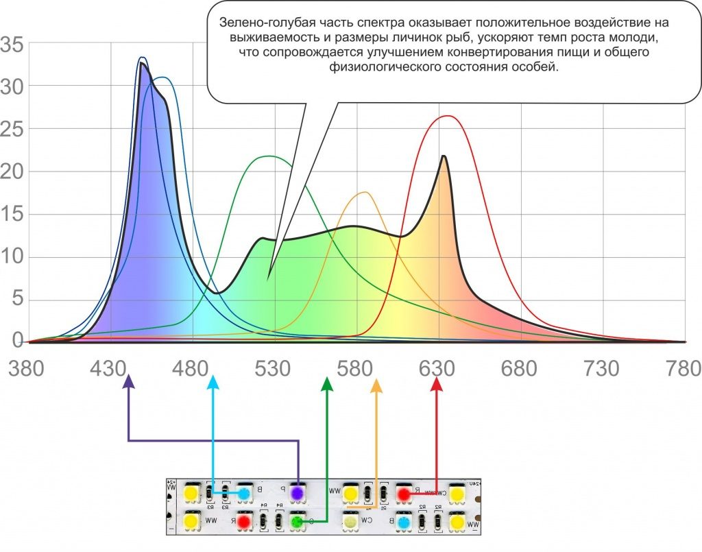 Правильная подсветка аквариума – это не просто мощный световой поток. Это свет с набором длин волн, необходимых для фотосинтеза. Спектр солнечного света перекрывает всю видимую человеческим глазом область, а также присутствует в УФ и ИК диапазонах. Потребитель солнечной энергии (в нашем случае – водное растение) само решает: свет какой длины волны ему необходим на данном этапе роста. Спектр люминесцентных и светодиодных источников является избирательным со всплесками интенсивности лишь в некоторых зонах видимого спектра. В таком случае растение вынуждено «наслаждаться» тем излучением, которое выдаёт подсветка.