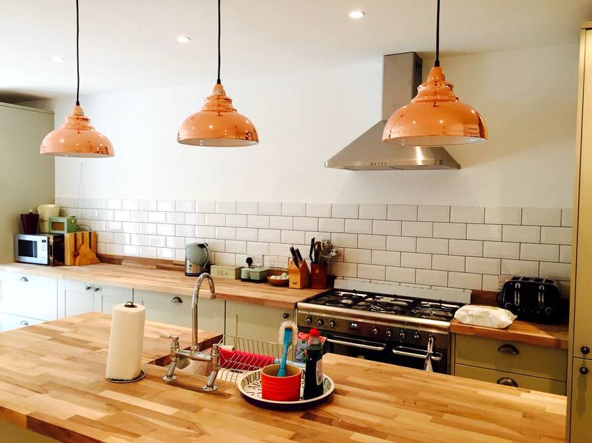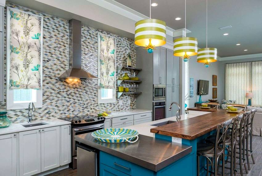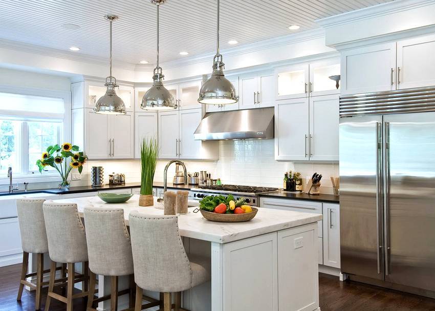Кухни в наших домах часто выполняют функцию обеденной зоны. Дизайнеры используют множество решений, чтобы и у этой области было нормальное освещение. Светильники, у которых делают подвесную модель крепления – одно из самых популярных решений. Можно использовать даже большие, красивые абажуры.