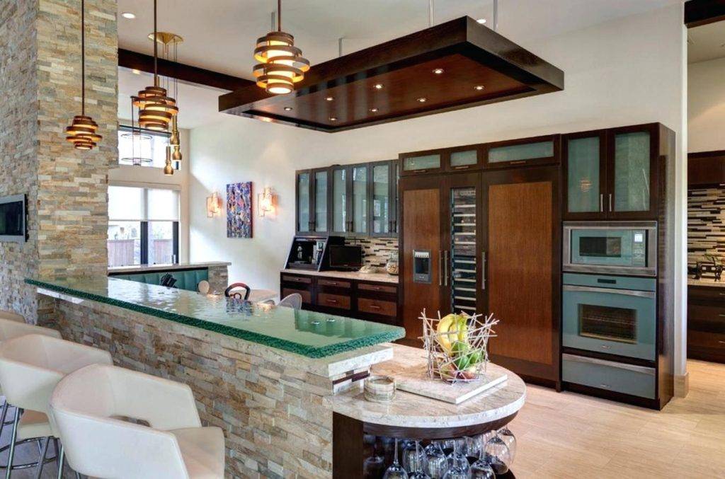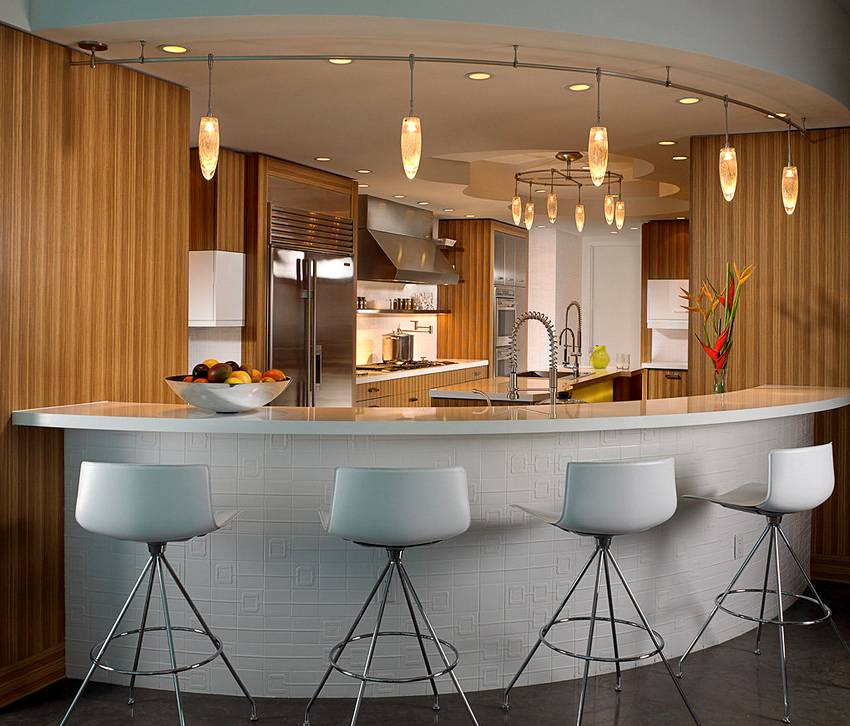 Над барной стойкой можно использовать те же правила, что и в случае с другими зонами. Здесь также пригодится грамотное использование локальных источников. Неплохо подходят для кухонь с барной стойкой так называемые скрытые типы светодиодных светильников. Декоративные бра неплохо дополнят общую атмосферу, тогда барная конструкция получает отличное украшение.