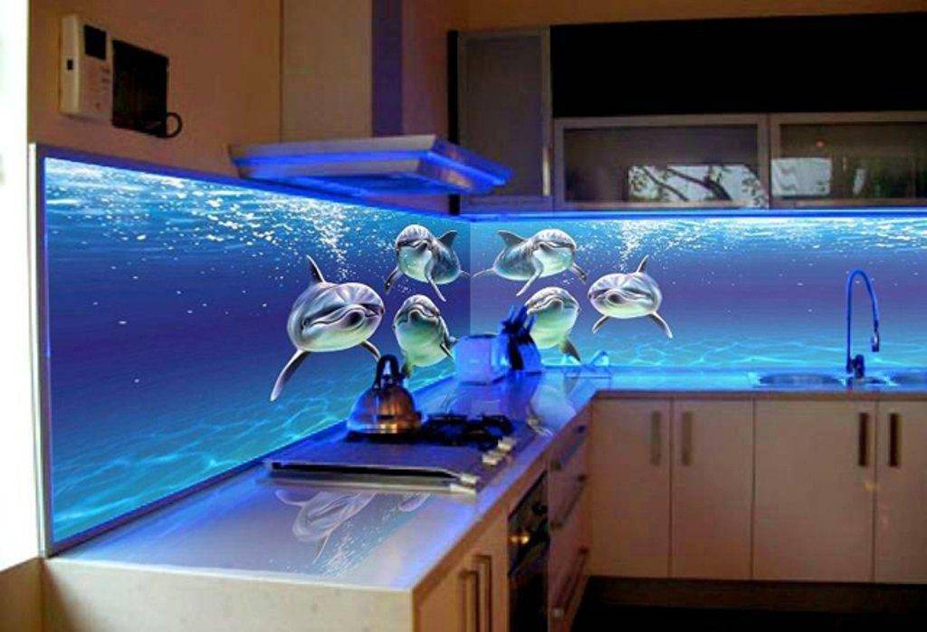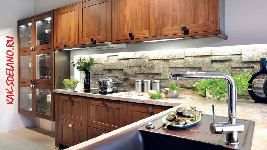 Подсветку можно обустроить внутри самой рабочей фурнитуры, а не у мебели. Можно выбрать стеклянные варианты фартука, который легко оборудуется светодиодными лентами.