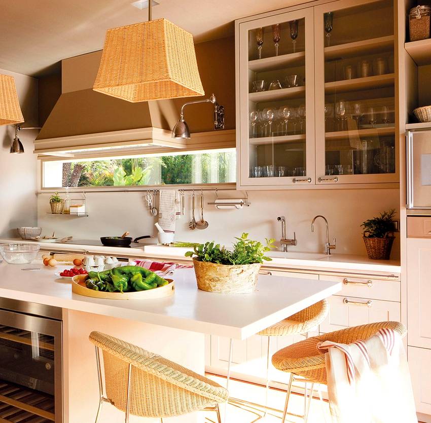 Первый вариант снижает работоспособность, быстро утомляет и вызывает апатию. Умеренно-желтый теплый цвет является естественным тоном, который создает спокойную, благотворную обстановку. Такой вариант освещения в кухне можно использовать в обеденной зоне для ежедневных семейных трапез и для рабочей поверхности.