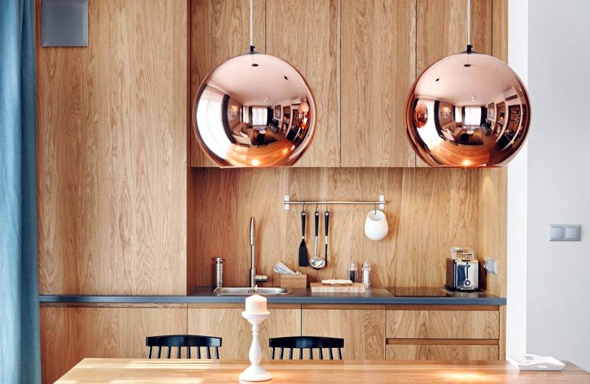 Для удобной эксплуатации и рационального использования электроэнергии важно обеспечить отдельное включение света для каждой функциональной зоны. Для кухни следует отдавать предпочтение простым по форме и минималистическим по дизайну светильникам, которые легко очищать от пыли, копоти и жира