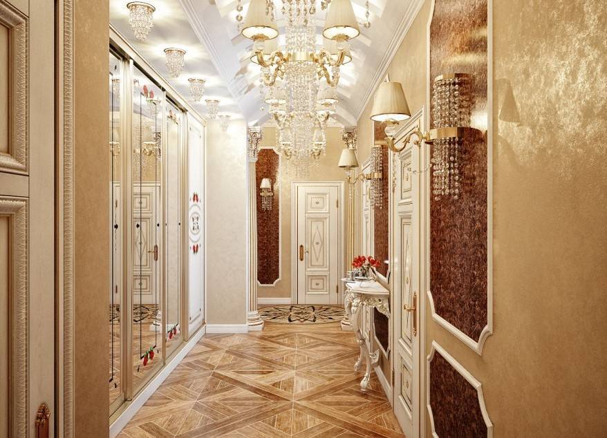 - В классицизме используются коричневые, песочные оттенки. Подойдут красивые настенные бра, украшенные позолотой, либо кованая хрустальная люстра. Все зависит от габаритов комнаты — в идеале это должна быть просторная прихожая.