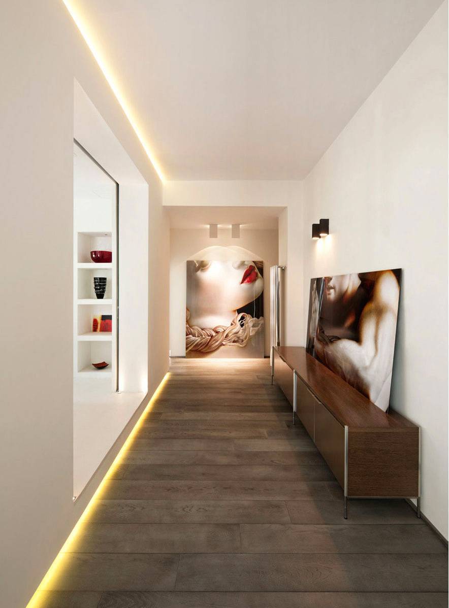 - Наилучшее решение, которое поможет вам полностью разрешить проблему освещения длинного коридора – это использование приборов, вмонтированных в подвесной потолок. При таком освещении применяются светодиодные ленты или (и) точечные светильники.