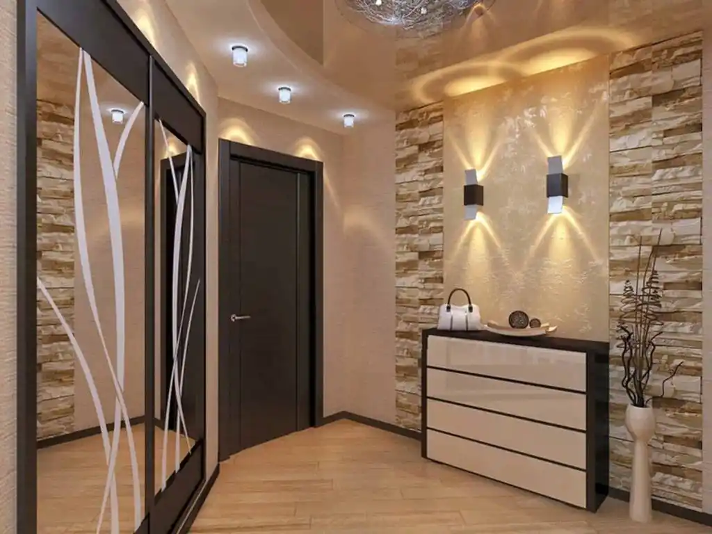 Предпочтительным местом для освещения прихожей является потолок. Он обеспечивает общее освещение вашего коридора, освещая всю площадь. Для потолочного освещения можно выбрать встраиваемые светильники, светодиодные ленты, люстры или подвесные светильники. Обеспечив правильное окружающее освещение, вы можете использовать точечные светильники или настенные бра для акцентного освещения. Эти светильники размещены в боковых стенах прихожей для создания дополнительного эффекта.