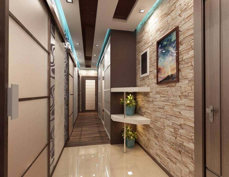 Коридор может отличаться разной конфигурацией. Существуют длинные и зауженные пространства, квадратные, маленькие помещения или большой просторный холл.