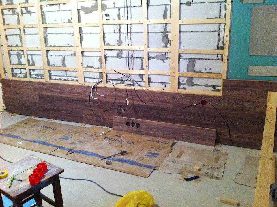 - Возможно использовать ламинат самый дешевый и тонкий, так как на стенах не важны показатели износостойкости.