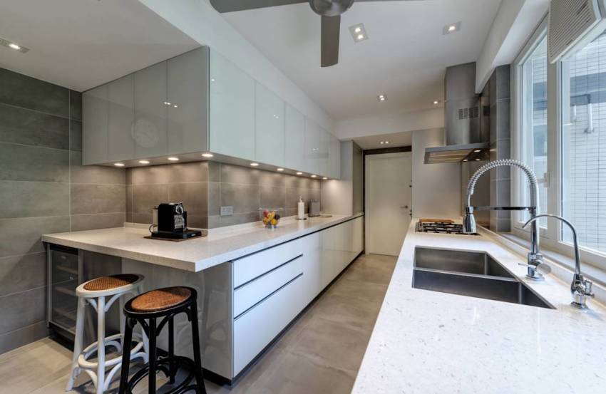 Столешница современной кухни может быть выполнена из устойчивого к механическим повреждениям камня. На пол можно положить ламинат, керамическую плитку или ковролин.