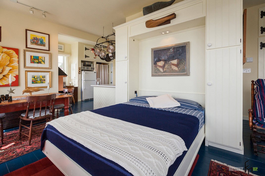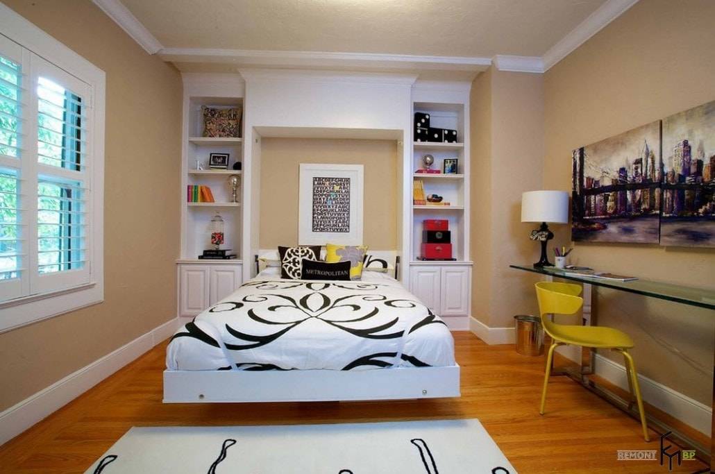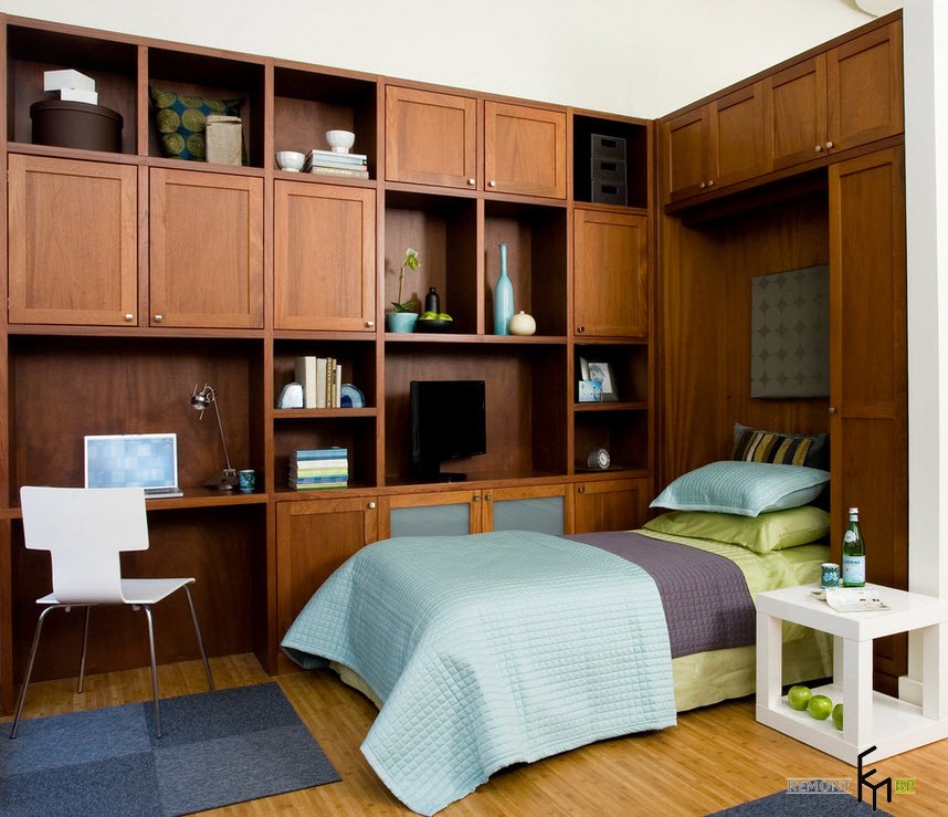 Шкаф со встроенной откидной кроватью можно разместить вдоль самой узкой стены, оставив достаточно места для опущенного ложе, после чего расставить остальные элементы мебели. Такого рода шкафы могут быть угловыми с множеством ящиков и полок для хранения.